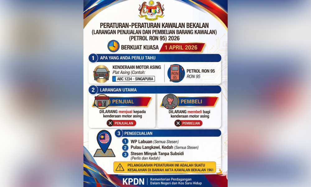 Poster itu memaparkan poster peraturan penggunaan petrol RON95 bermula 1 April 2026 dalam bahasa Melayu dan Inggeris.