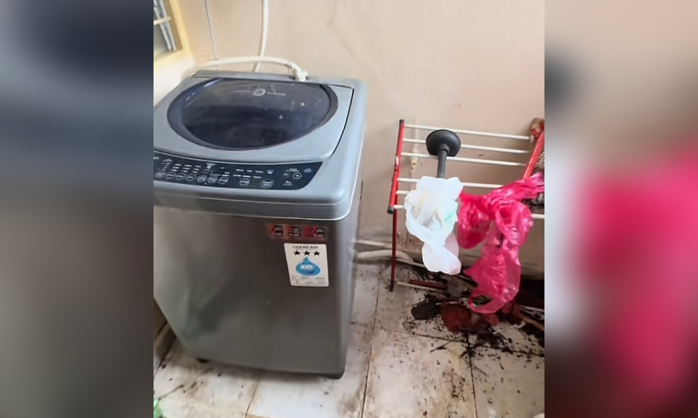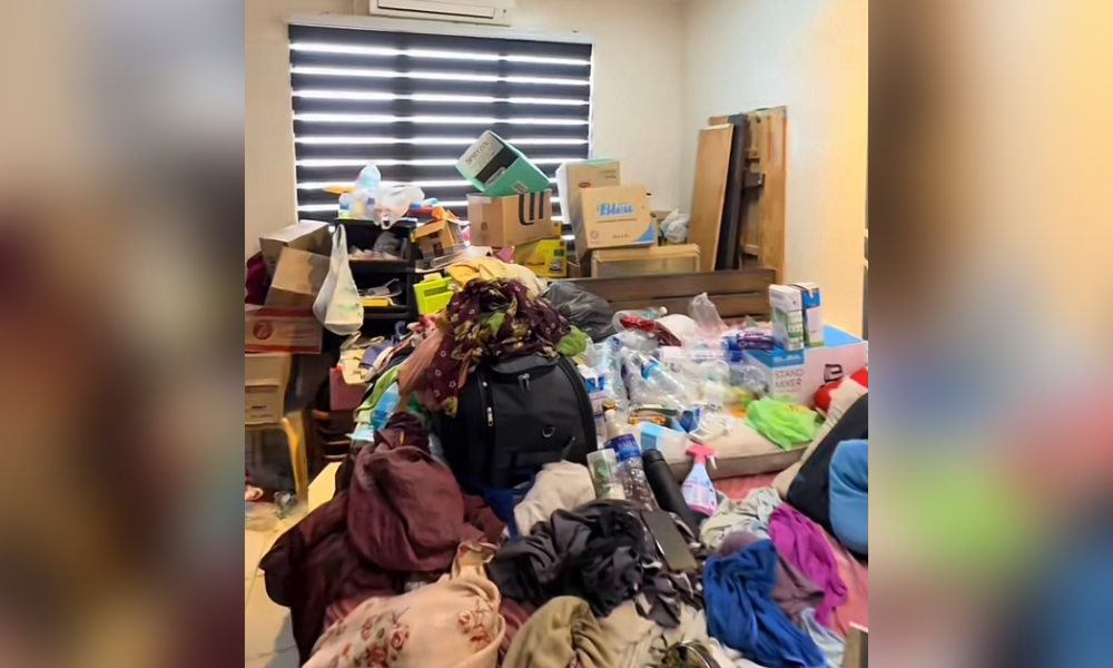 Dalam video dimuat naik ke media sosial, kelihatan ruang tamu dipenuhi longgokan pakaian, plastik sampah dan kotak.