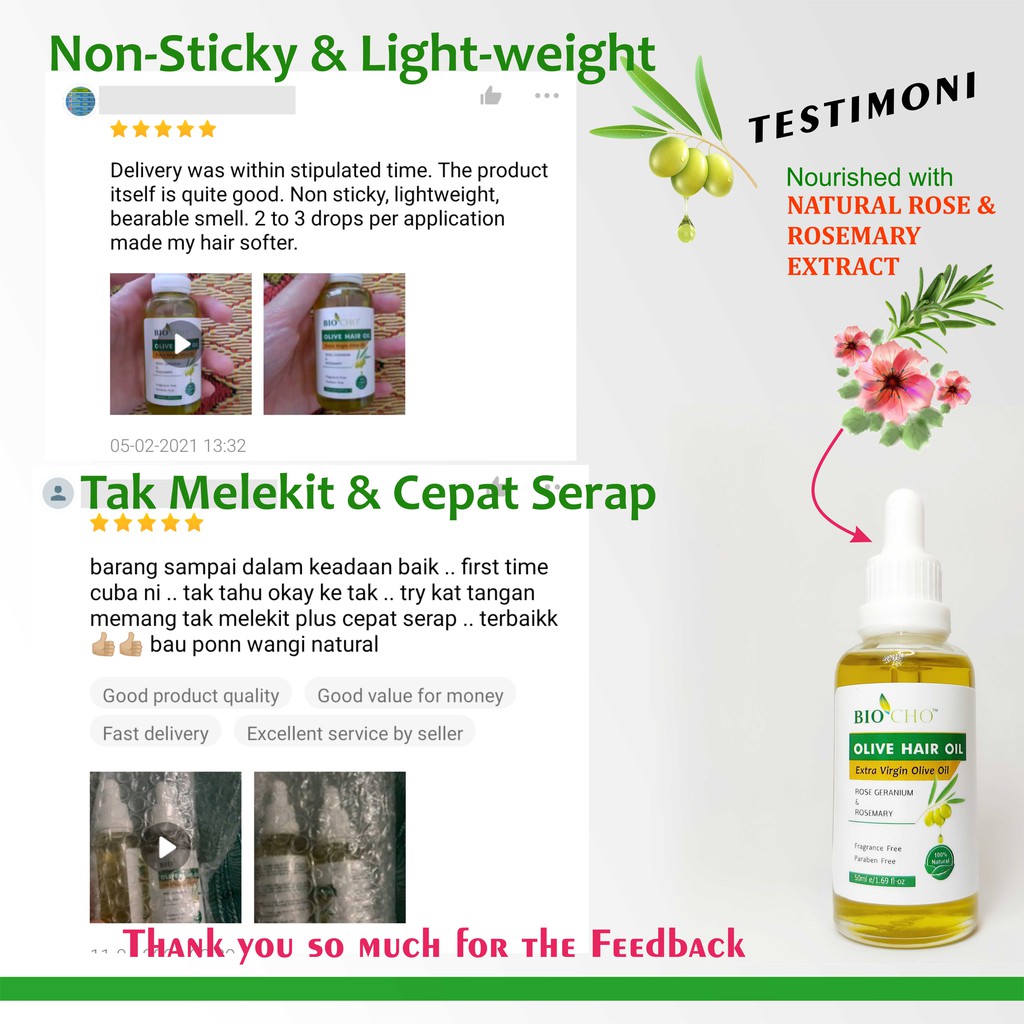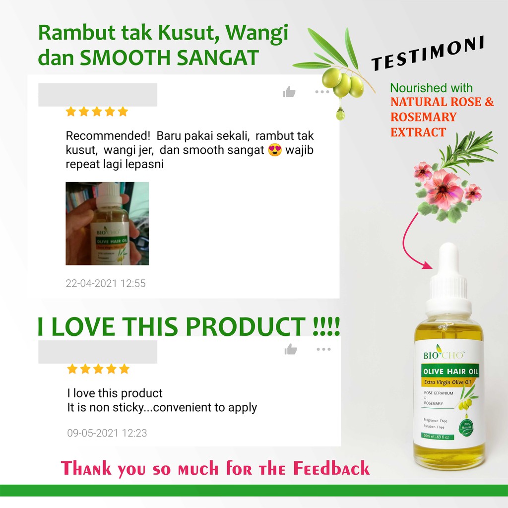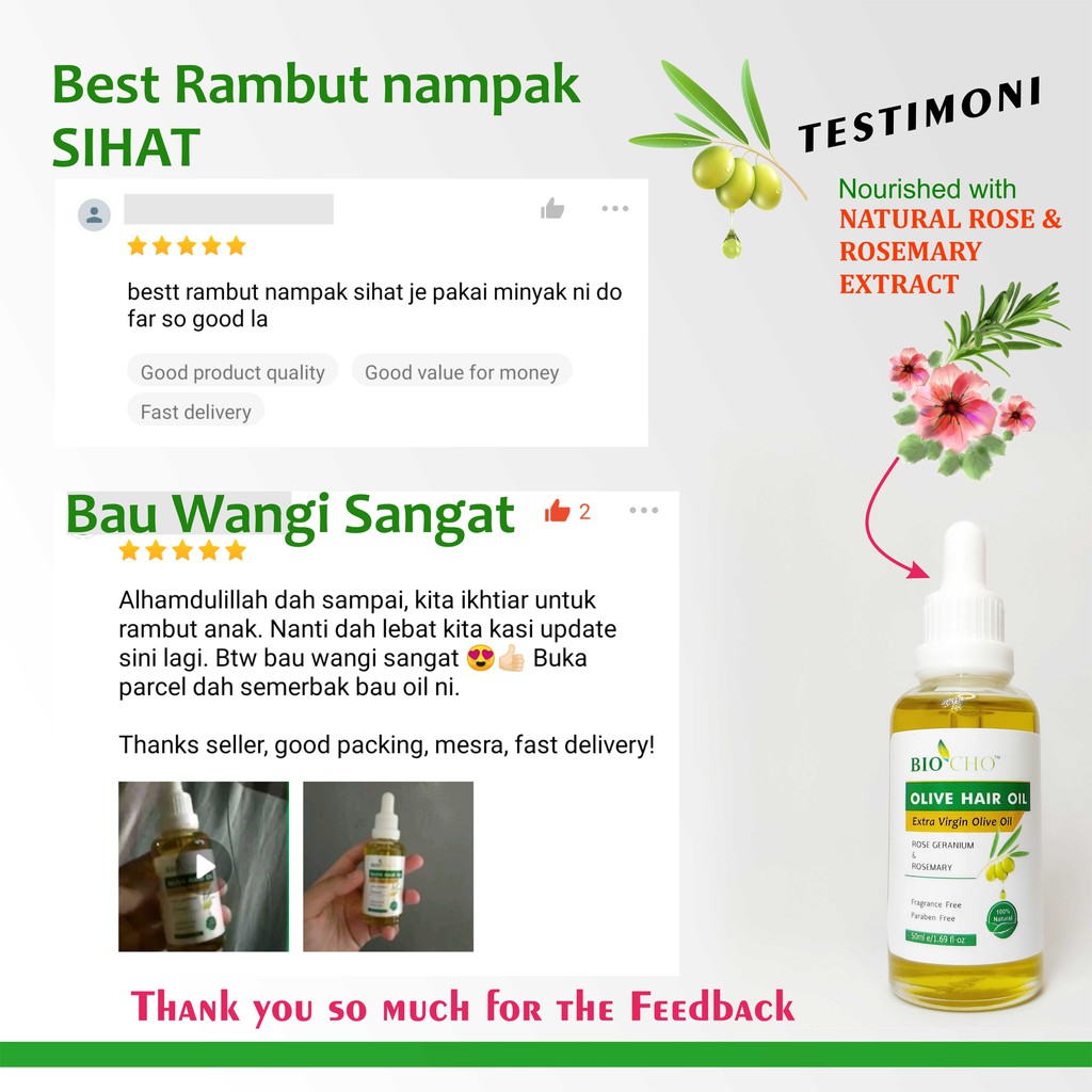 Minyak rambut zaitun ni memang terbaiklah! Bau semulajadi rose yang wangi menggoda hati. Rambut jadi kuat, licin, dan cantik bersinar.