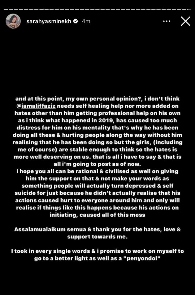 Dalam pada itu, Sarah akui bahawa dia dan wanita-wanita yang pernah dikaitkan dengan Aliff sewajarnya mendapat kebencian dan kecaman orang ramai memandangkan mereka mampu berfikir dengan waras jika dibandingkan dengan keadaan mental Aliff.