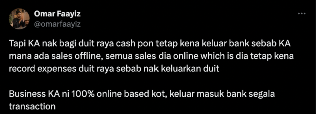 Semua ‘sales’ dia ‘online’ di mana dia tetap kena catat segala ‘expenses’ duit raya sebab nak keluarkan duit.
