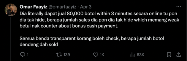 Menerusi ciapan balas, Omar menjelaskan bahawa meskipun Khairul memberikan bonus secara tunai, dia tetap perlu ke bank untuk mengeluarkan duit.