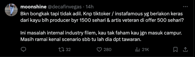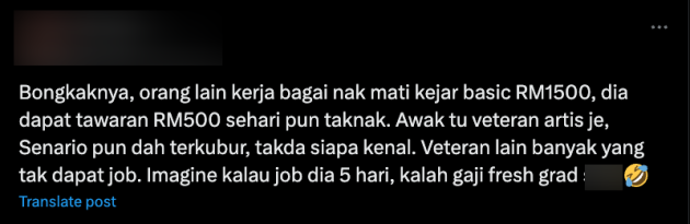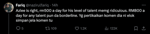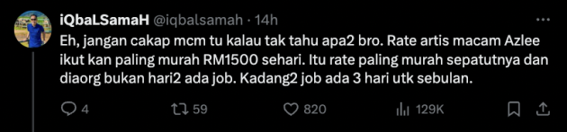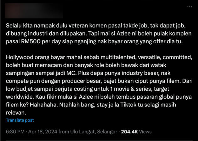 Menerusi ciapan tersebut, individu berkenaan berpendapat Azlee tidak sepatutnya merungut dan perlulah bersyukur kerana masih lagi mendapat tawaran berlakon meskipun ditawarkan dengan harga yang rendah.