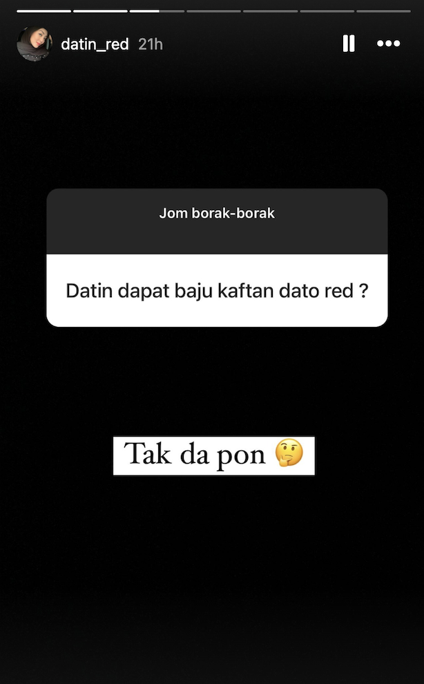 Menjawab kepada persoalan tersebut, Datin Red memberi bayangan seakan suaminya itu tidak pulang beraya kerana tiada gambar mahupun video bersama yang dimuat naiknya pada 1 Syawal.